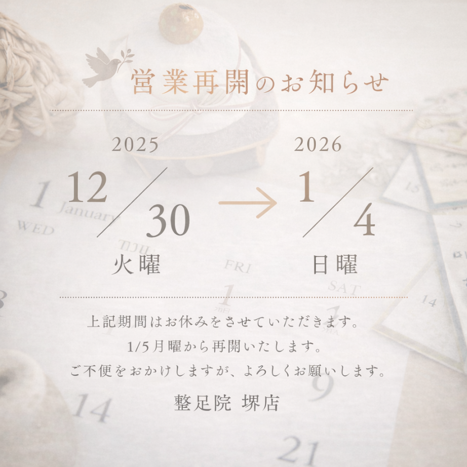 大阪にある整足院堺店は、これらの足の悩みを専門的に対処しています。専門家のアドバイスや施術を受けることで、足の痛みや不快感から解放されることが期待できます。さあ、快適な歩行生活を手に入れましょう!